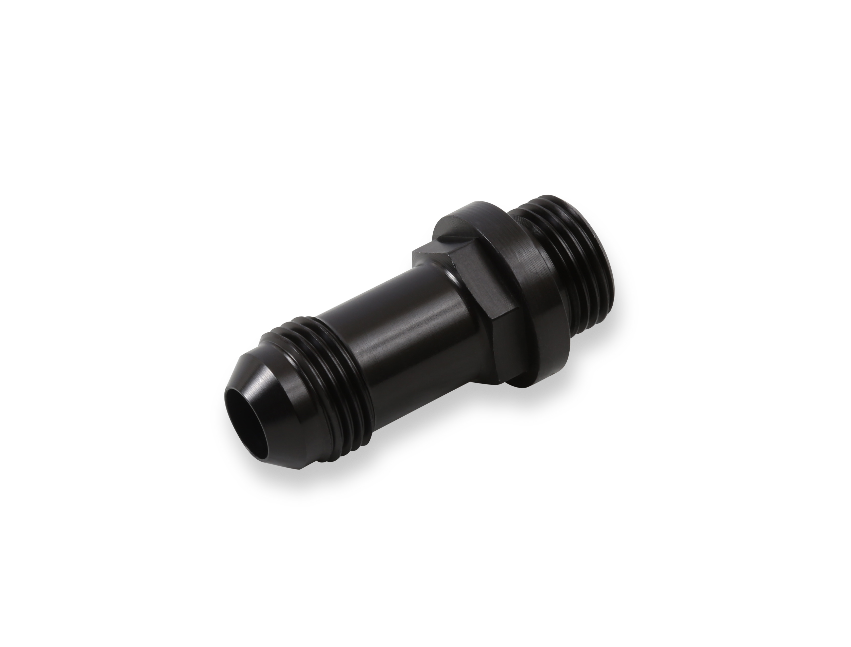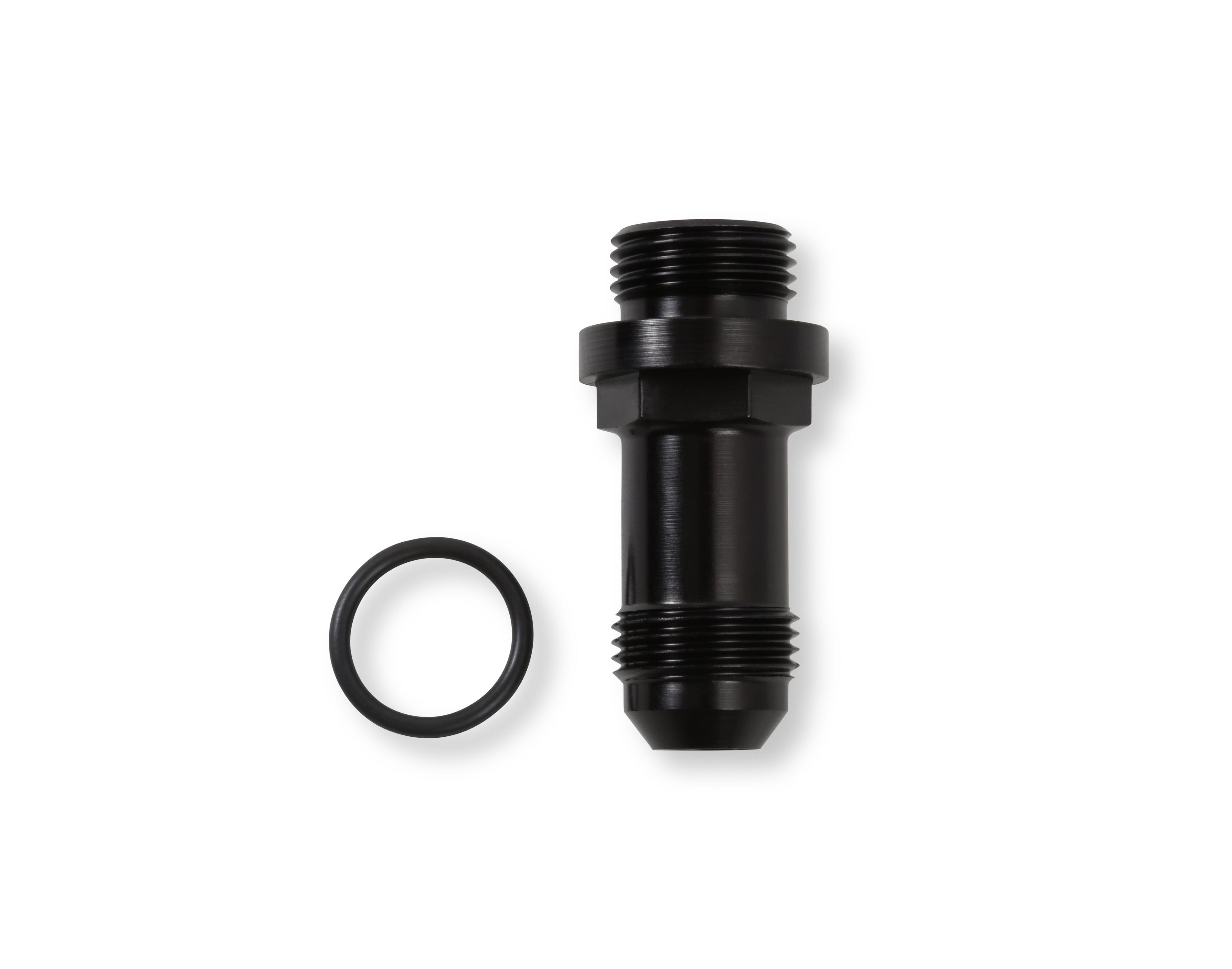 Long -8AN male fuel inlet fitting (black) with -8AN o-ring threads for Ultra XP fuel bowls.