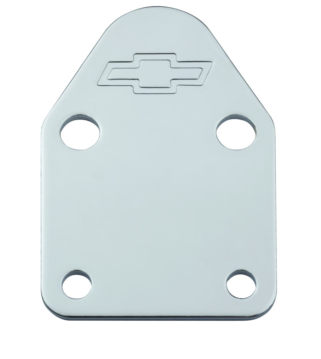 Premium Chrome Fuel Block-Off Plate. Triple chrome plated and stamped with the handsome Chevrolet Bowtie. Made from quality steel material. For use on Small-Block Chevrolet V8s. Mounting bolts not included. Sold as each