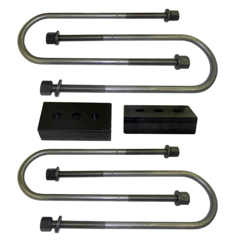 Each Rear Leveling Kit includes CNC Drilled and Located Solid Steel Blocks, Heavy-Duty U-Bolts, Tall Nuts and Washers.