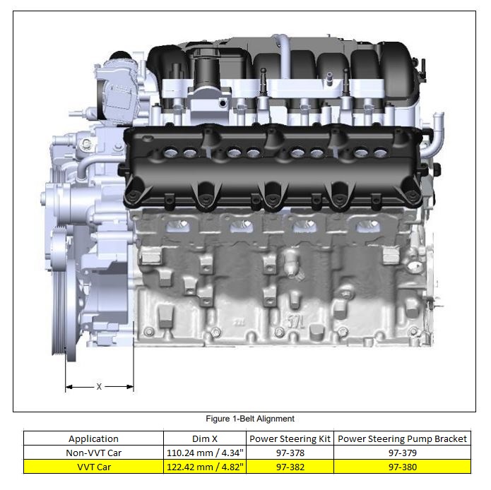 Power Steering Kit w/ Saginaw Type II Pump, Mounting Bracket, and Pulley. Fits 2014 & Up Gen III Hemi Engines (5.7L and 6.4L). Fits Engines with 4.82 Damper Spacing (see Drawing).