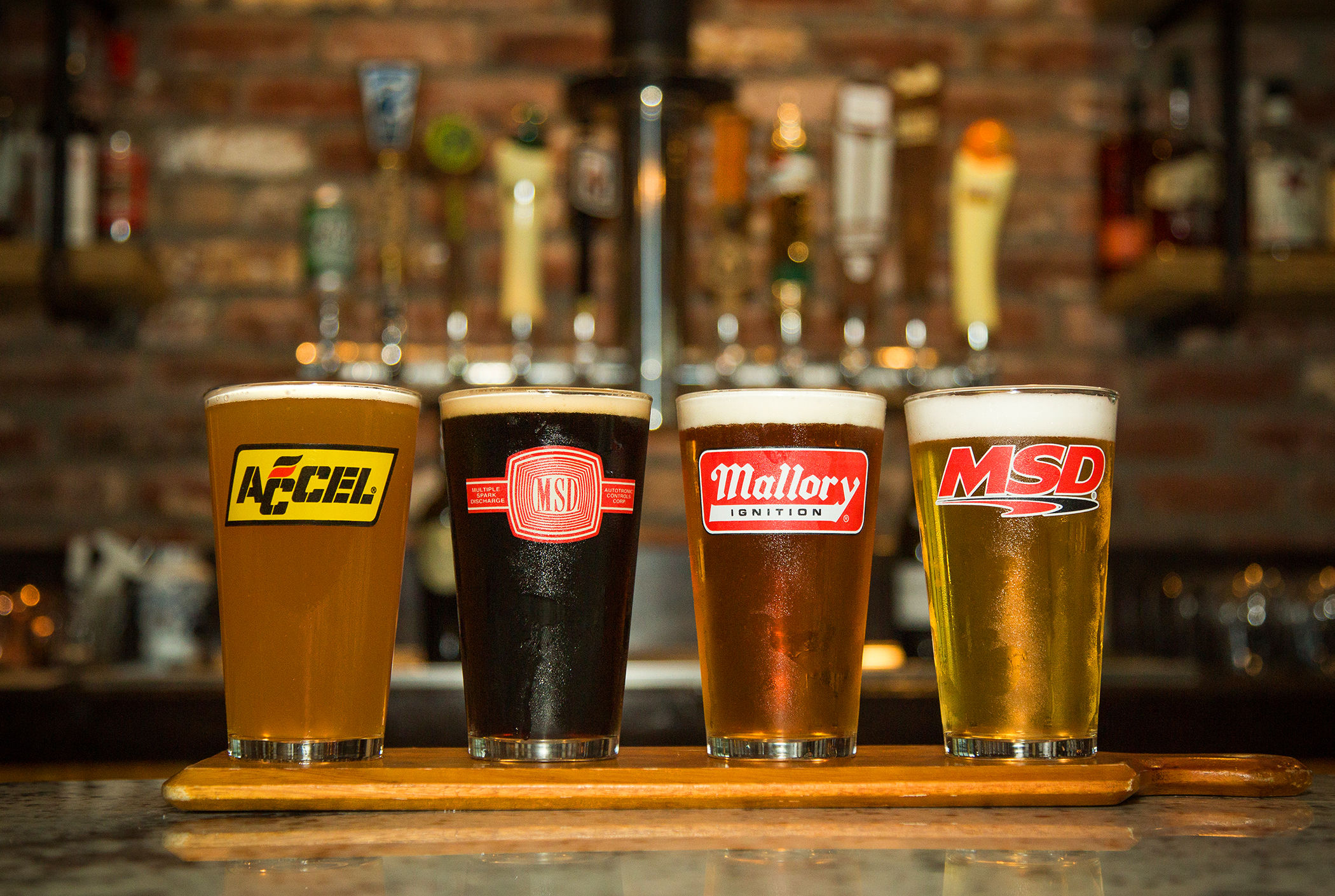 Holley 16oz. Pub Glasses 4-pack (Series 3) with assortment of logos including: ACCEL, Mallory Ignition, Current MSD logo and Vintage MSD logo.
