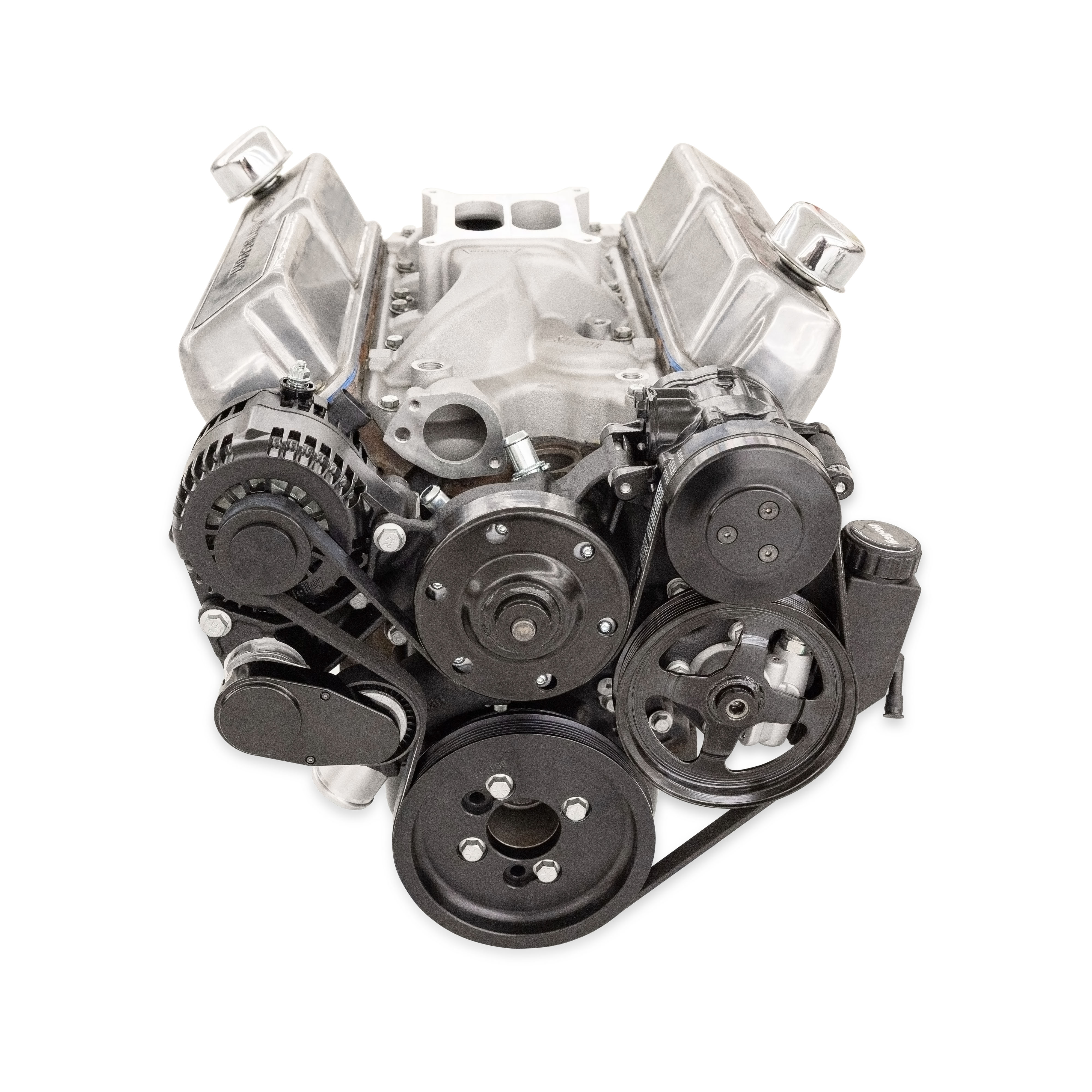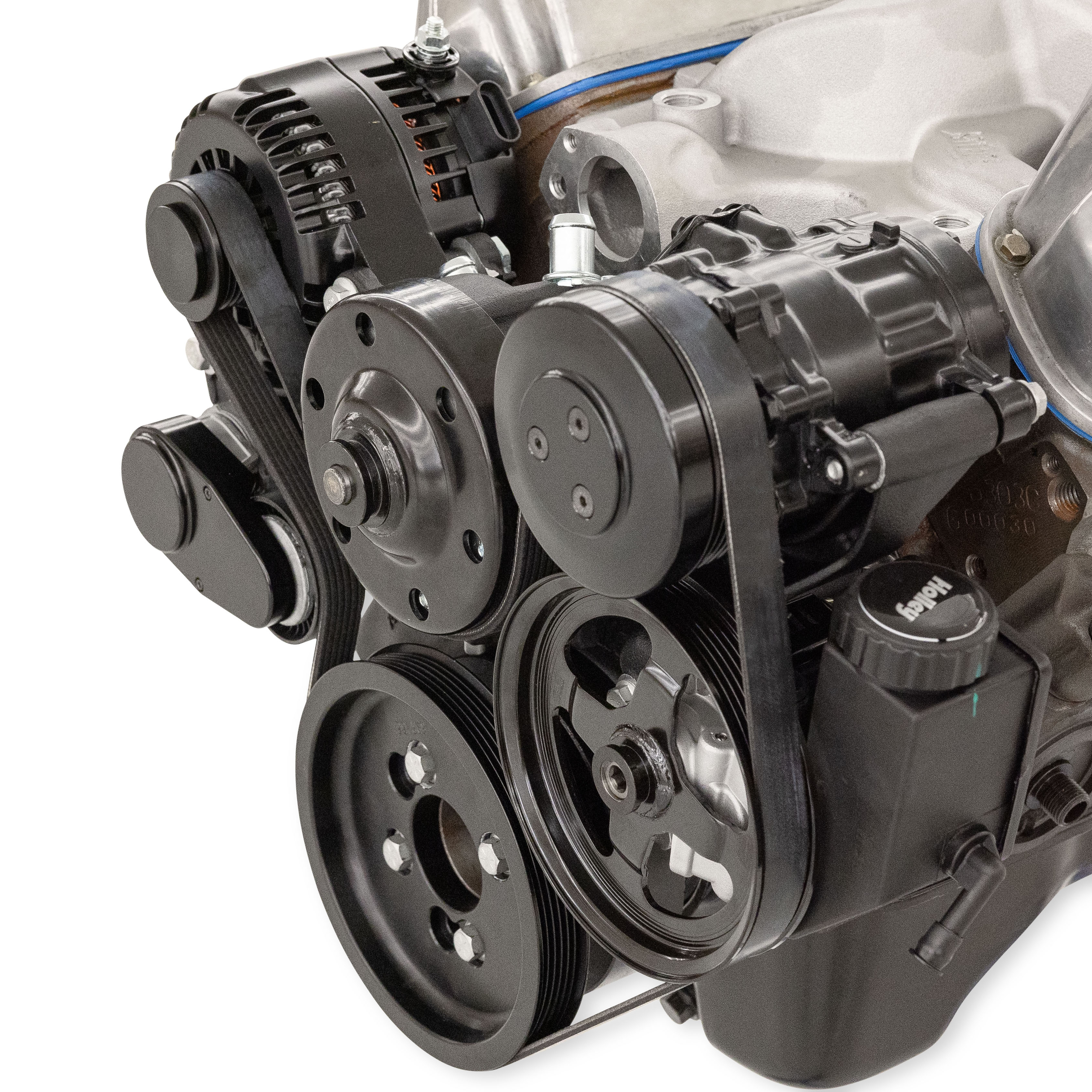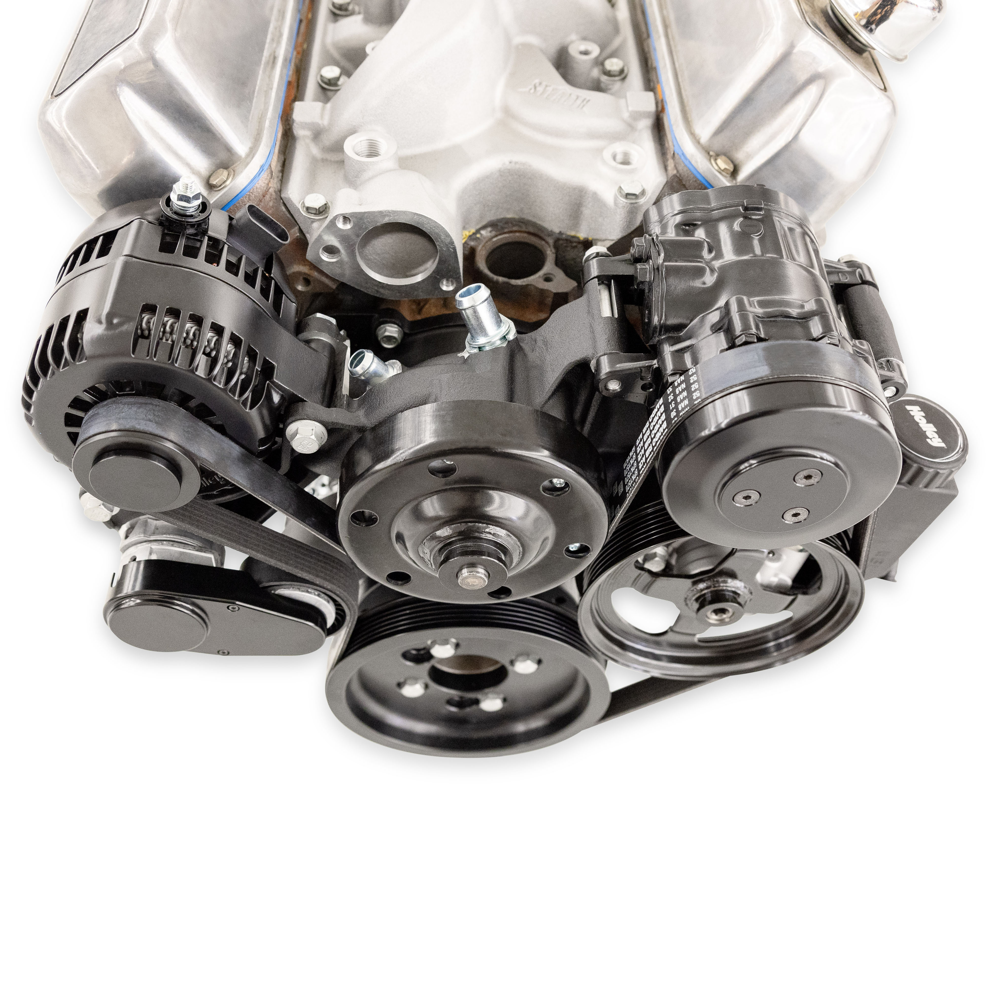 - Billet alternator, tensioner, and compressor pulley covers