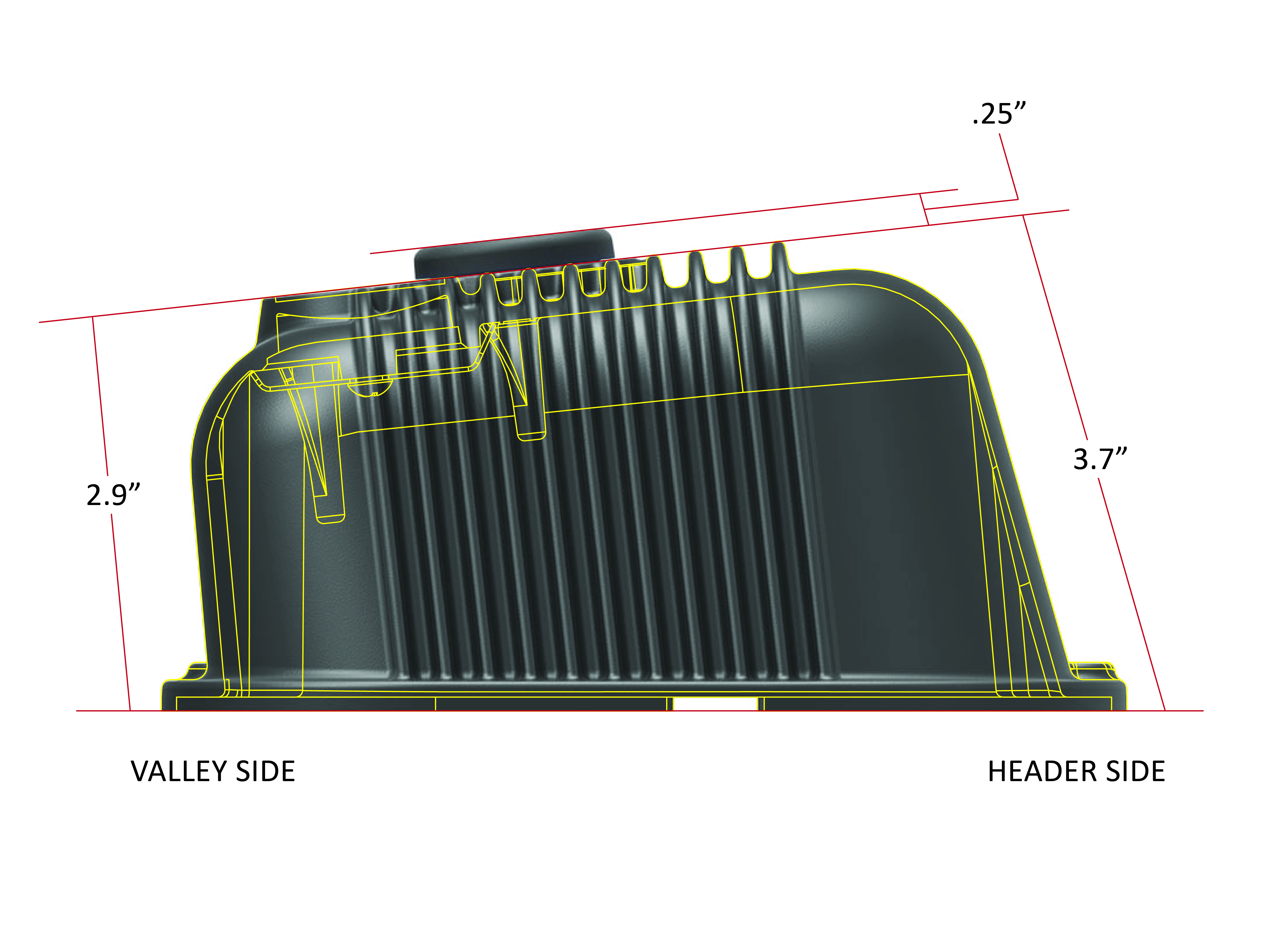 - 2.5” clearance at lowest internal wall (valley side) and 3” internal clearance (header side) with cast-in oil drippers