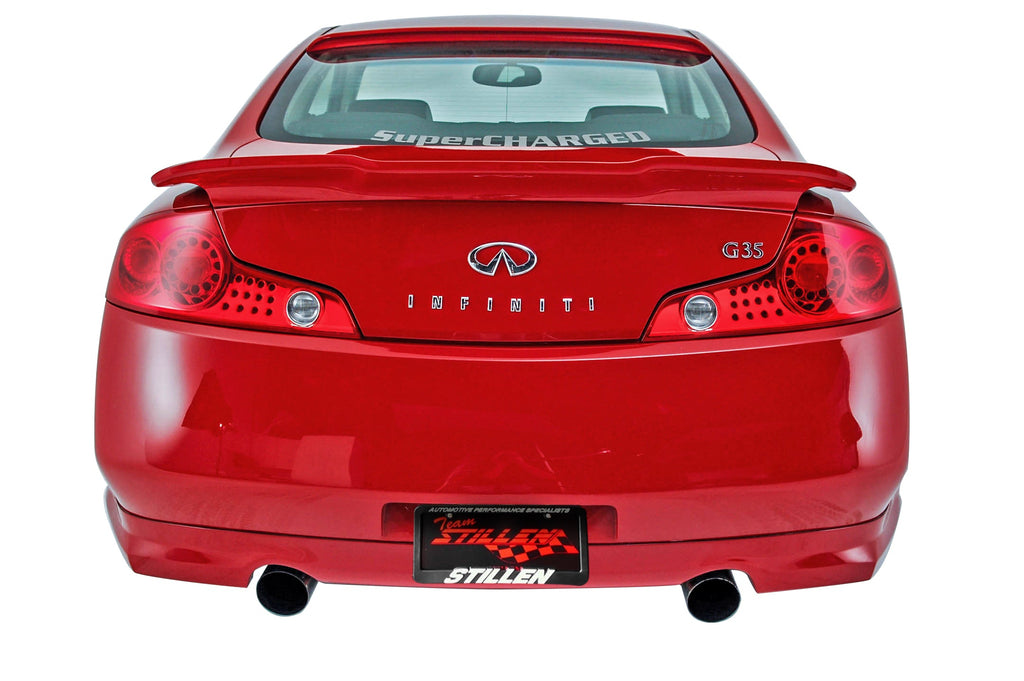 2003-2007 Infiniti G35 Coupe Rear Valance - 103618 STILLEN's Rear Valance for the 2003-2007 Infiniti G35 creates an aggressive touch with a superior fit and finish for the sports car. The look, feel, fit, and finish are factory quality thanks to the direct molding process STILLEN employs. Molding the urethane directly to the body of a G35 at our in-house design studio, craftsmen are able to understand the car's contours firsthand enabling them to produce the best urethane products possible.