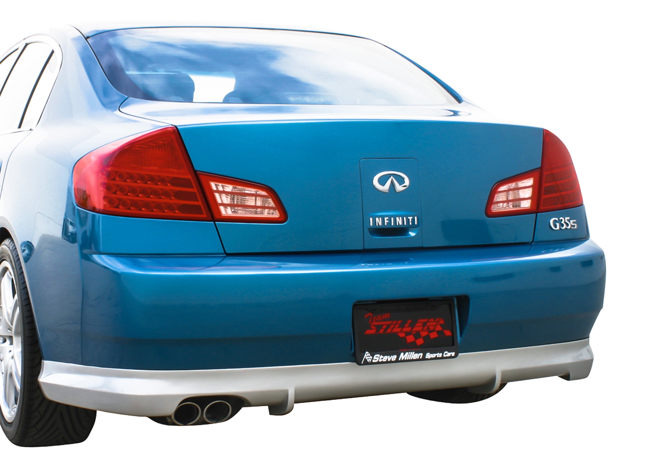 2003-2004 Infiniti G35 Sedan Rear Valance - 103718 STILLEN's Rear Valance for the 2003-2004 Infiniti G35 Sedan creates an aggressive touch with a superior fit and finish for the sports car. The look, feel, fit, and finish are factory quality thanks to the direct molding process STILLEN employs. Molding the urethane directly to the body of a G35 at our in-house design studio, craftsmen are able to understand the car's contours firsthand enabling them to produce the best urethane products possible.