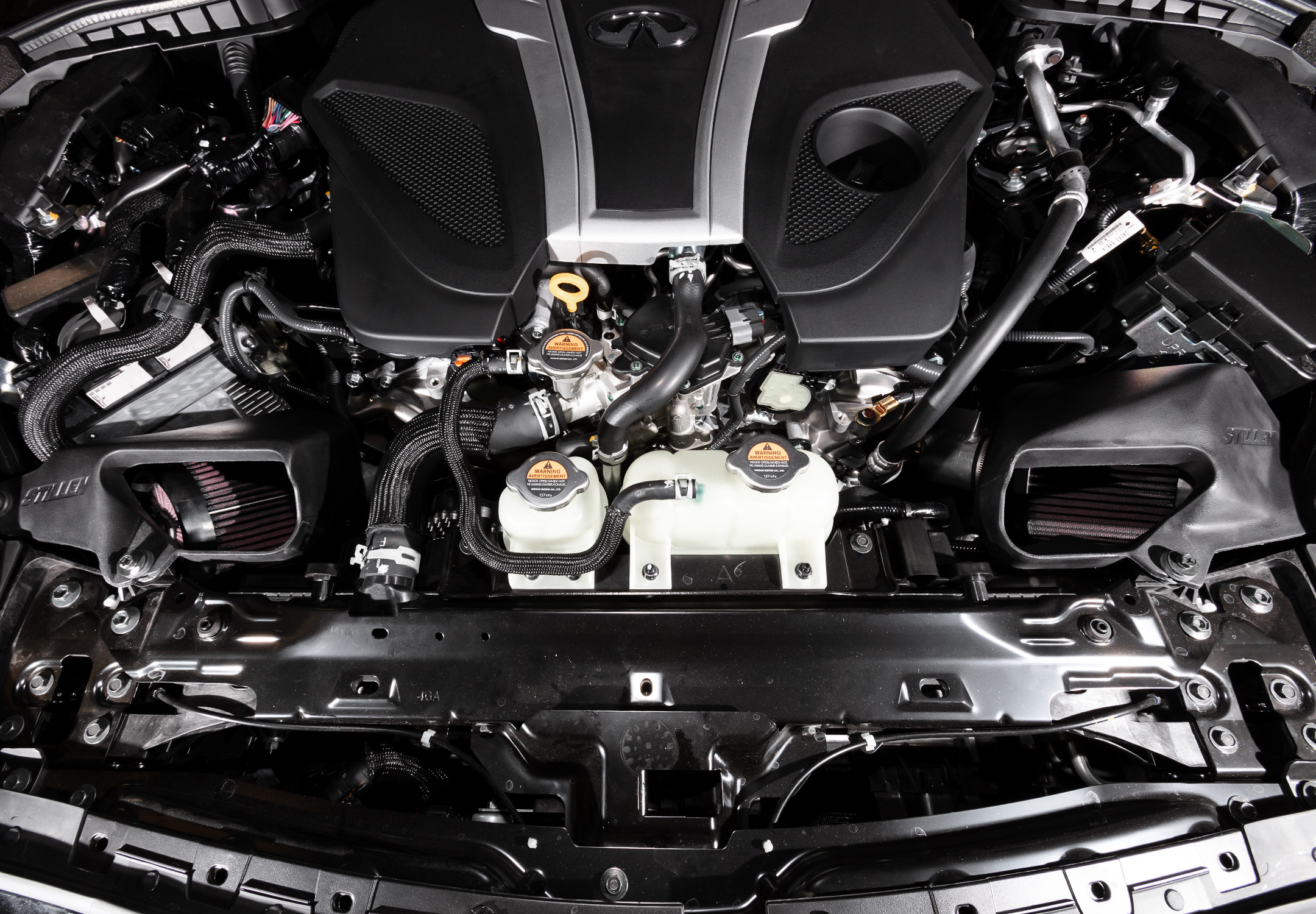 Featuring two custom molded urethane heat shields and air ducts, the STILLEN Hi-Flow Intake for Infiniti 3.0t engines is a true COLD AIR INTAKE - none of that 'warm air intake' nonsense you get when you just leave two filters exposed and unshielded under the hood. What really sets the 3.0t apart from the non-turbo VQ cars that preceded it is just how big an impact the temperature of your incoming air charge makes.
