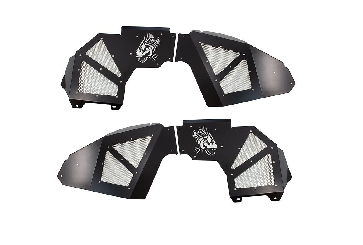 If you have Tube Fenders, you need a set of Aluminum Inner Fenders to finish the look. Once installed these offer protection from rocks and debris entering the engine compartment. These are stamped from Aluminum with the Fishbone Offroad Logo then powder coated black.