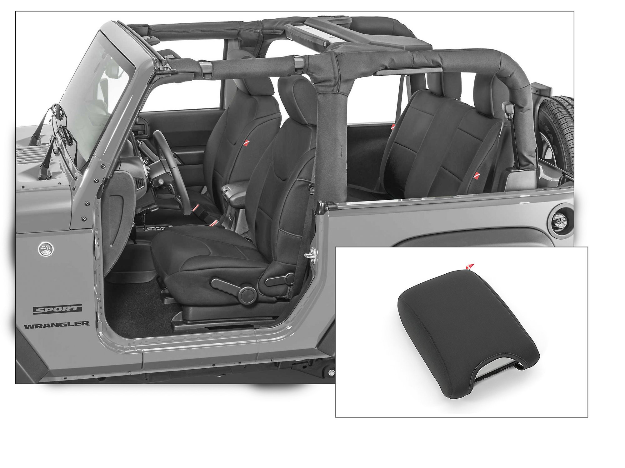 Jeep Wrangler Neoprene Seat Covers with Free Center Console Cover for 07-10 Wrangler JK 2 Door Black Diver Down. Purchase a set of Front and Rear Diver Down Seat Covers and Receive a Matching Free Neoprene Console Lid Cover! It'ss like having custom made wet-suits for your Wrangler seats!