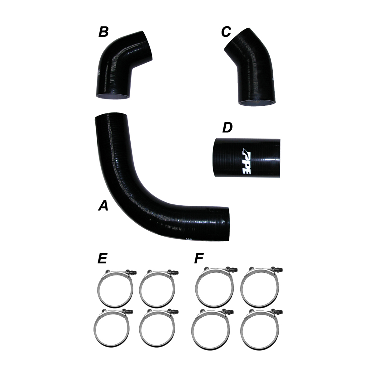 Each PPE Performance Silicone Hose is strengthened with 5 plies of polyester reinforced fibers making them very tough. The Fluorocarbon lining offers better lubricity (slippery and resistant to chemicals) and the silicone rubber construction ensures that they can withstand constant boost pressures from -76 degrees all the way to +437 degrees Fahrenheit. In short, PPE Performance Silicone Hoses will not blow out like a stock hose will.