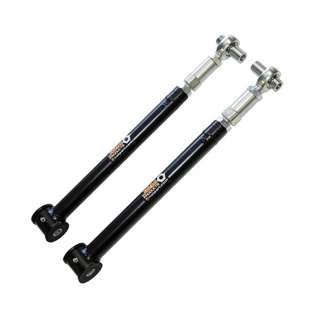 Mustang Lower Control Arms Red Powdercoat 05-14 Ford Mustang Adjustable Lower Control Arms Replace those weak, factory stamped lower control arms with J&M Products extreme duty tubular adjustable arms. These are a direct bolt-on replacement that minimize wheel hop, improve cornering, lowers ET’s and greatly helps your track consistency. The chrome-moly heat treated spherical rod end allows your rear suspension to be bind free which makes these a great upgrade for both your track and auto cross driven car. We designed these to have the polyurethane bushings bolted to the cars chassis for a quiet comfortable operation.