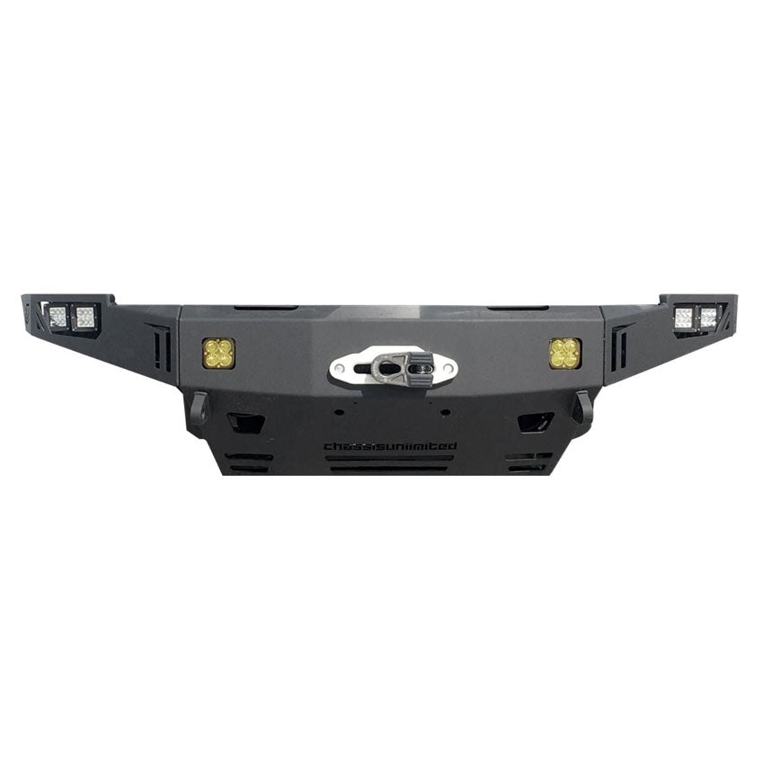 The Chassis Unlimited Octane Series front winch bumper ships to your door ready to install on your truck, complete with our 3-Stage texture black powder coat.