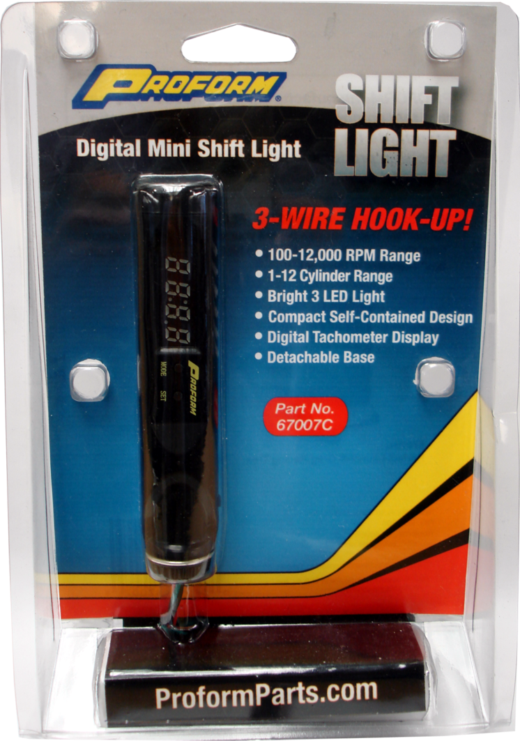 Easy to set digital shift light will help you leave your competitor eating exhaust at the track! The new Proform Mini Digital Shift Light and Diagnostic Tachometer can be easily installed in vehicles with 1-12 cylinders. Measuring at only 4-1/4 inches long, this 3 LED light will give you the signal when it is time to shift! All settings are easily controlled with two buttons. Features include a 100-12,000 RPM range in 100 RPM increments, Cylinder range of 1 thru 12, Adjustable brightness for the digital display, and a display on/off feature when in use. Also, when you are in the garage tuning your ride, you can easily detach the shift light from its mount and place it on your dashboard so the tachometer digital display is facing out...so you can see it while you're tuning. Imagine that...no more yelling into the house to get somebody to tell you when your engine is at 3000 RPM! Simple, Innovative, Affordable...that's PROFORM! Sold individually.