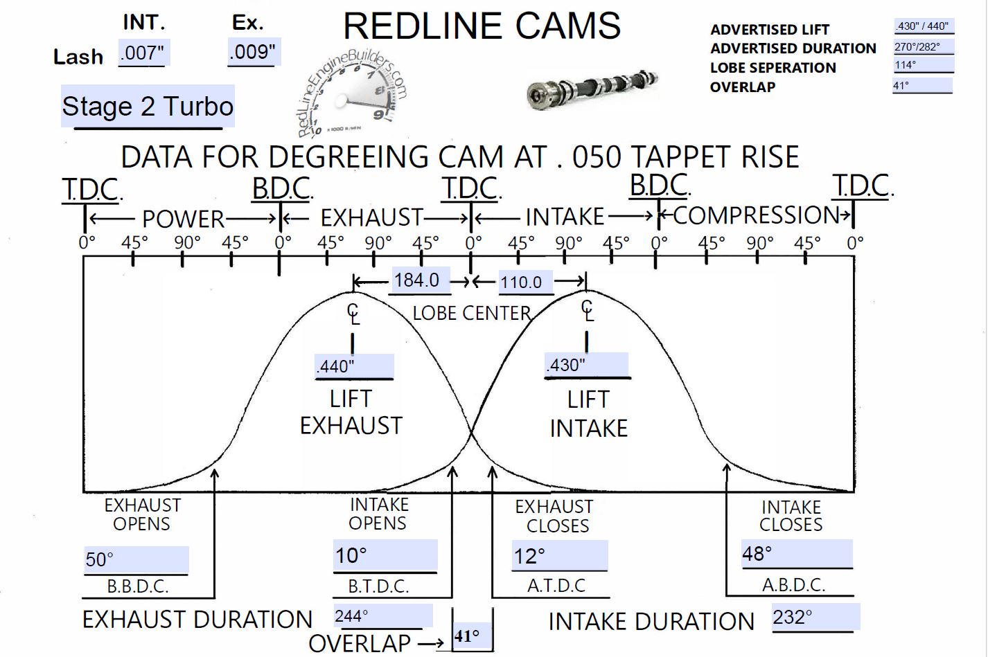Our Stage 2 Turbo Camshaft has 232 degrees of duration on the intake and 244 on the exhaust with a 114 degree lobe separation, this takes advantage of the increased cylinder pressure, allowing you to use the boost your turbo is making.