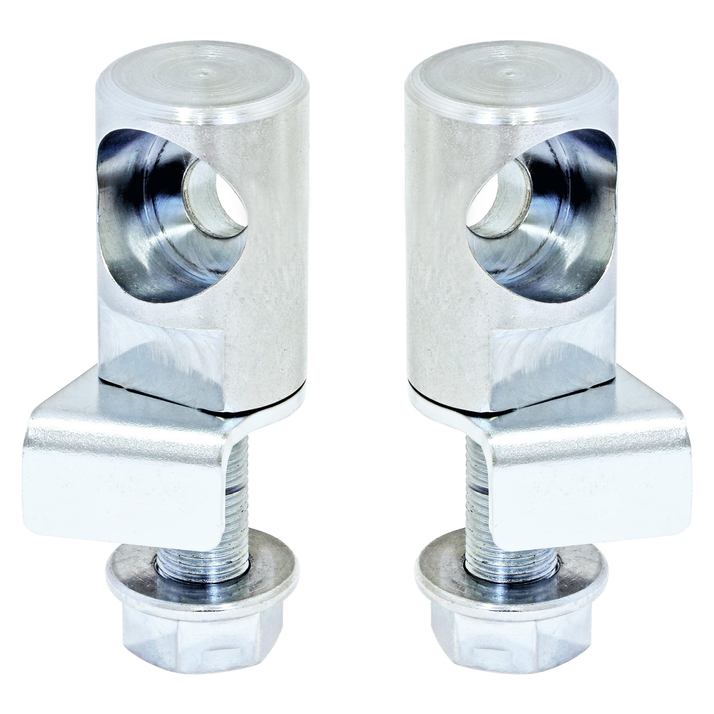 The bores in the side of the mounts allow our end link rod ends to bolt up with the rod end nut installed into the bore on the side of the mount.