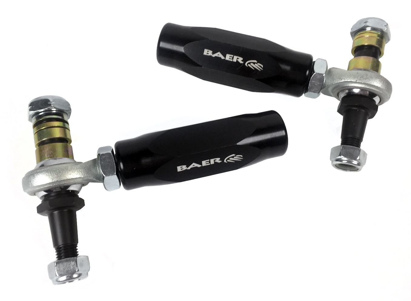 The BAER Trackers feature a 6061 T-6 fully machined sleeve that is anodized black, that is mated to a Teflon lined heim joint and machined pin which has correct taper so spindles are not required to be drilled/modified. These are vehicle specific pieces that help correct bumpsteer issues do to modified suspensions and/or poor OE design. Best of all these are made in the USA!