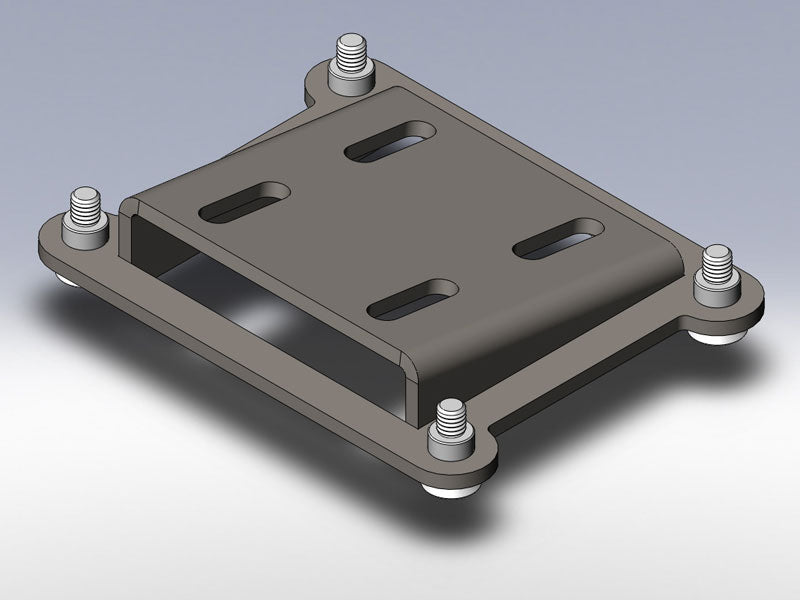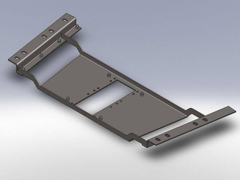 The cradle is laser cut from 3/16 and will bolt into OEM location and pick up the transmission mount. This allows you to service your drivetrain without removing the whole skid plate, and also gains strength to the skid plate system. The actual skid plate is laser cut from 1/4 steel and is completely flat.