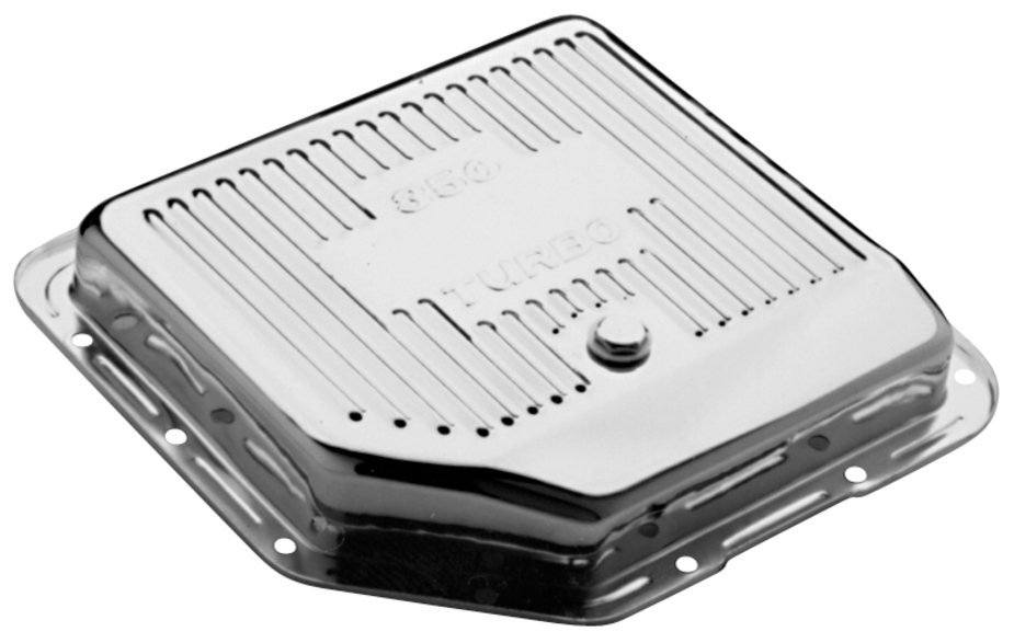 Premium Transmission Oil Pans. Chrome plated high-quality steel pan with fins for additional strength. Stock-pan depth. Chrome drain plug makes it easier to change the fluid and filter. Sold Individually.