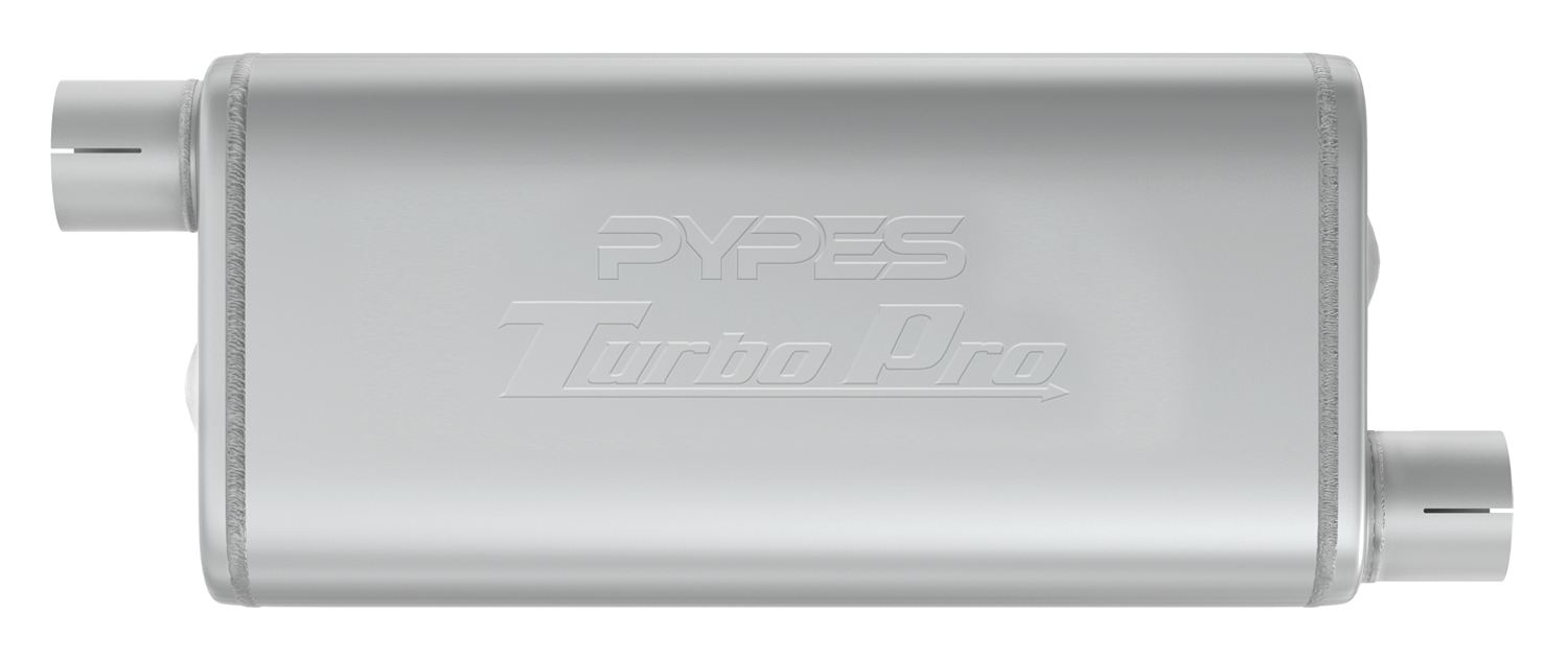 Pypes Exhaust Turbo Pro Mufflers feature flow control channels that eliminate drone, resonance, and flow turbulence while maintaining a steady flow of exhaust gases that result in a truly quiet performance exhaust note. The flow progression of this muffler mimics the CFM of a straight pipe without the annoying drone or resonance.