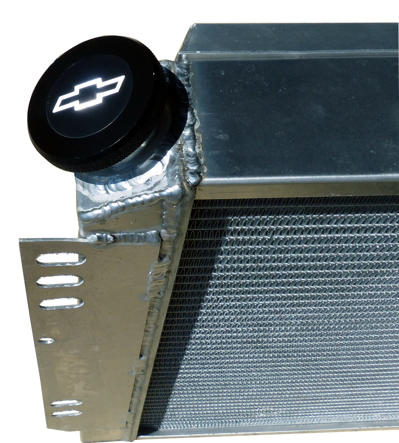Why not make the first thing you see when you open your hood a Bowtie radiator cap? This sleek radiator cap is comprised of three parts: a Stant 13 psi radiator cap, a black anodized aluminum cap cover with knurled perimeter, and lastly an embossed metal Bowtie emblem that can be centered nicely after the radiator cap has been installed. This ensures the Bowtie is lined up the way you want it to be! Sold individually.