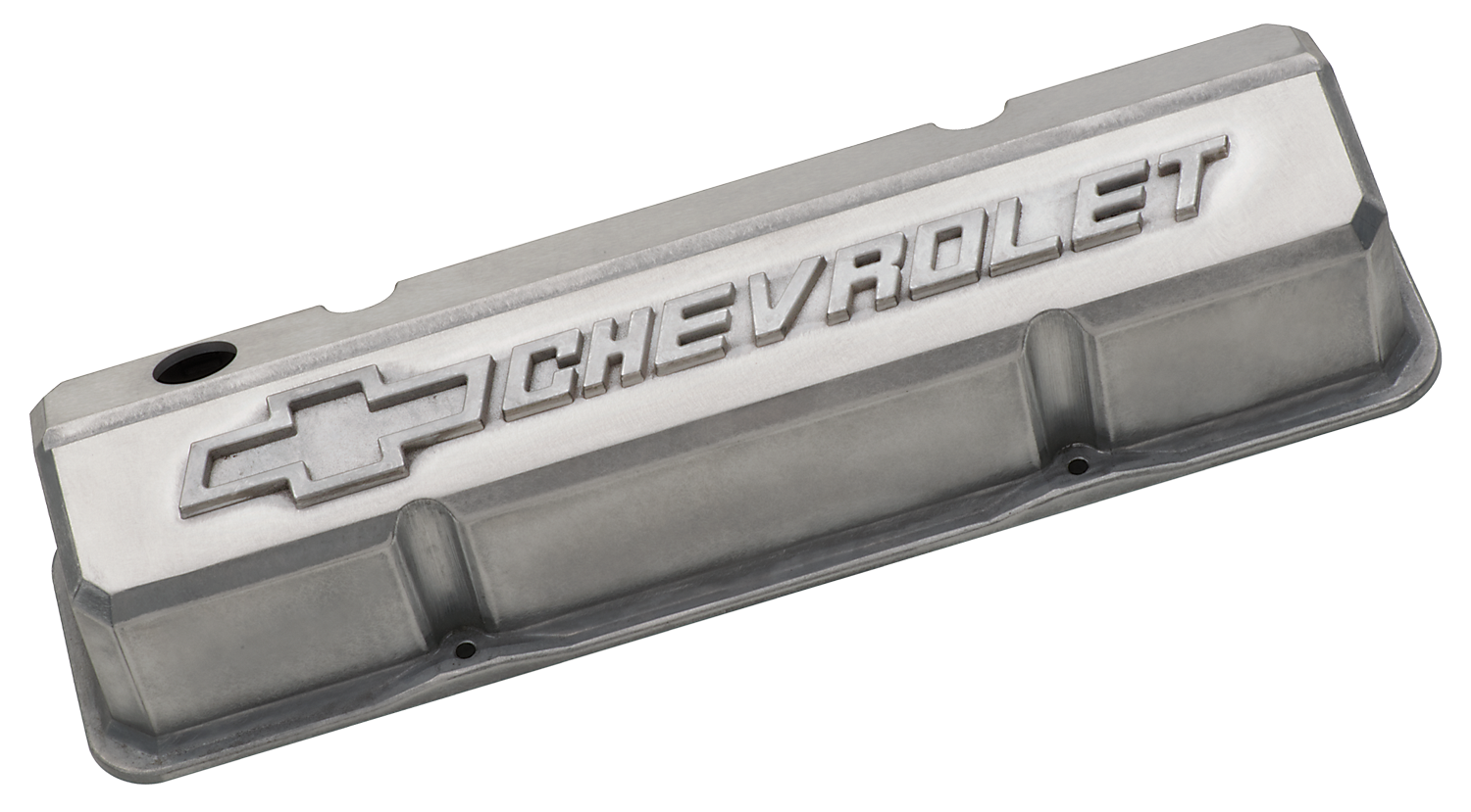 Valve Covers Slant Edge Tall Alum Unpolished W/Raised Bowtie Logo SB Chevy Raised Chevrolet & Bowtie Logos Chevrolet Performance Parts