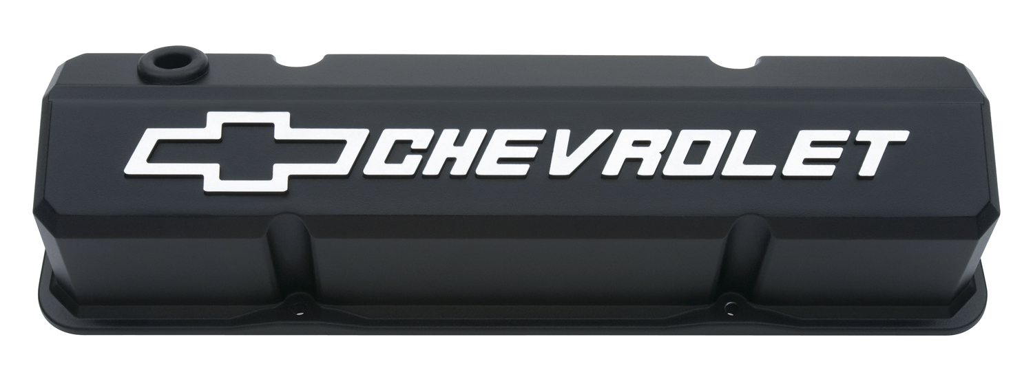 Valve Covers Slant Edge Tall Die Cast Black W/Raised Bowtie Logo SB Chevy Raised Chevrolet & Bowtie Logos Chevrolet Performance Parts
