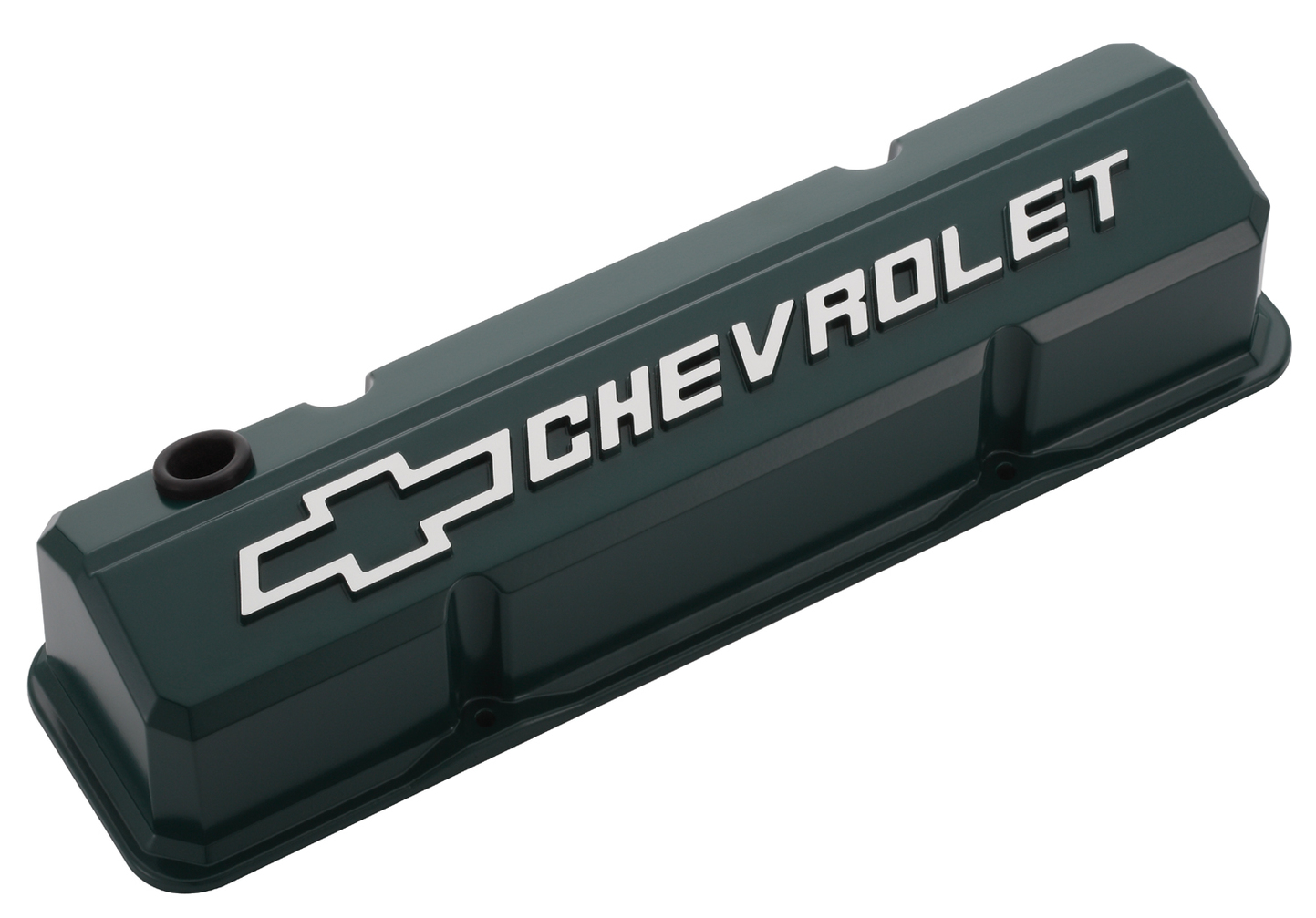 Valve Covers Slant Edge Tall Die Cast Green W/Raised Bowtie Logo SB Chevy Raised Chevrolet & Bowtie Logos Chevrolet Performance Parts