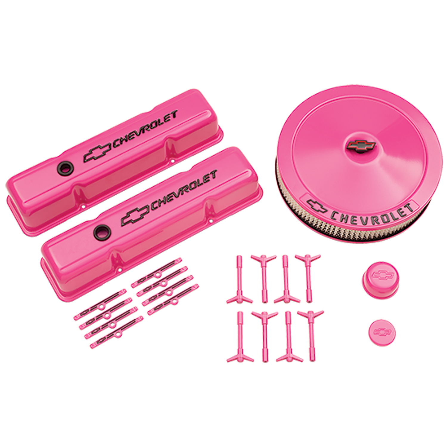 This engine dress-up kit features a great looking pink finish with black Bowtie logos and black Chevrolet lettering. Made from high quality steel that is 20 percent thicker than many other aftermarket valve covers. Designed to fit Small Block Chevy engines 1955 to 1986.