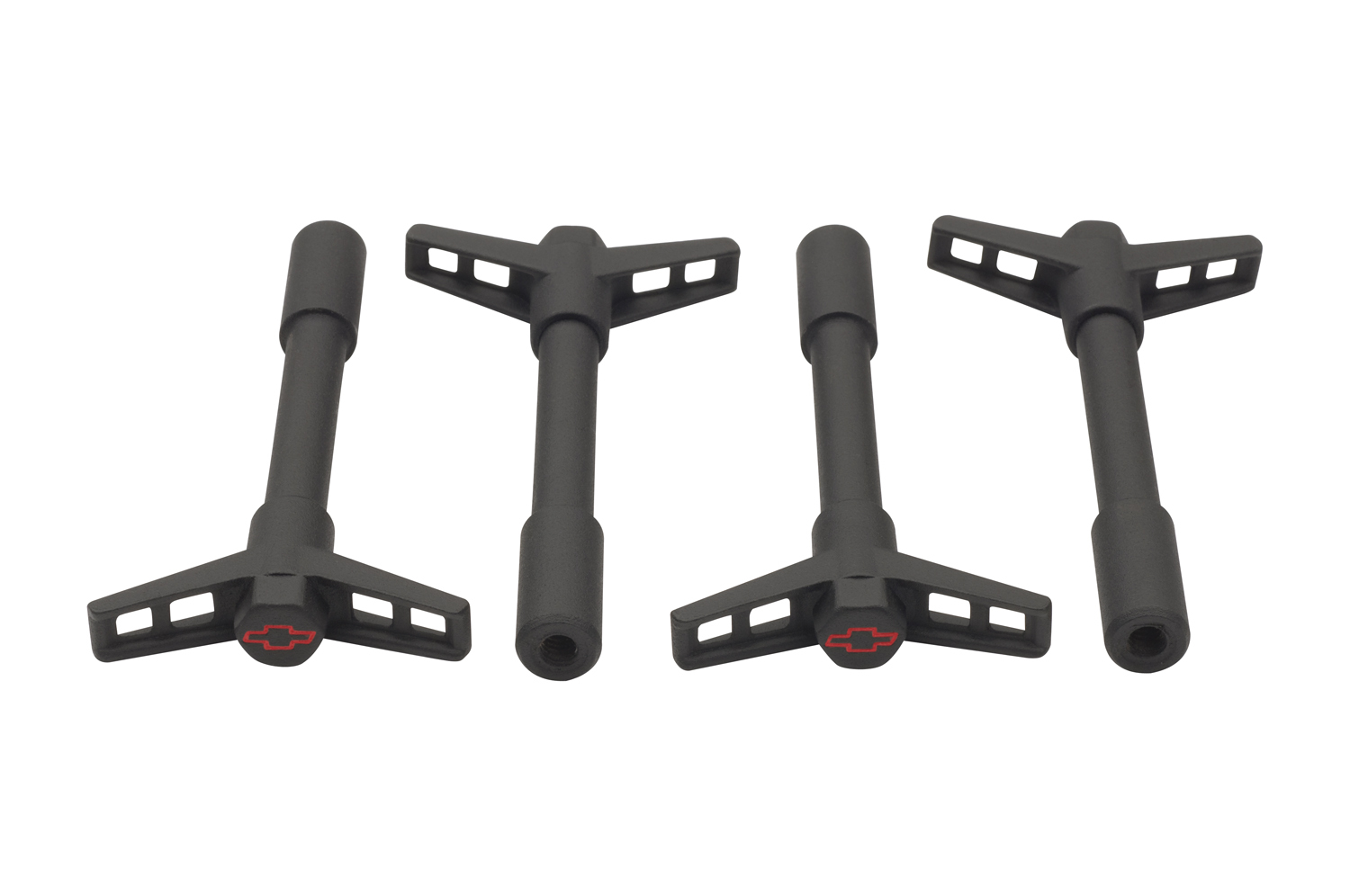 Premium Chrome Wing Nuts. Chevrolet Bowtie Emblem is cut sharply into the top of each wing nut. The lower ends of the shafts are manufactured with wide shoulders for broad load distribution, and each wing nut is supplied with a separate stud which permits precise gasket positioning on the head prior to mounting the valve covers. Fits Chevrolet small and big block, and V6. 1/4in x 20 thread. Officially Licensed Chevrolet Performance Product. Sold as set of 4.