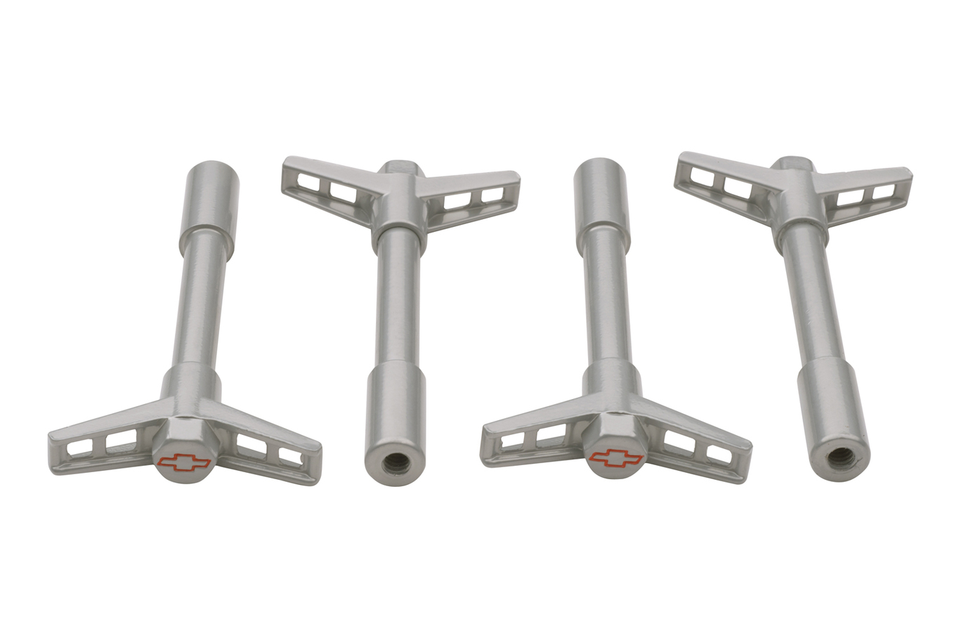 Premium Chrome Wing Nuts. Chevrolet Bowtie Emblem is cut sharply into the top of each wing nut. The lower ends of the shafts are manufactured with wide shoulders for broad load distribution, and each wing nut is supplied with a separate stud which permits precise gasket positioning on the head prior to mounting the valve covers. Fits Chevrolet small and big block, and V6. 1/4in x 20 thread. Officially Licensed Chevrolet Performance Product. Sold as set of 4.