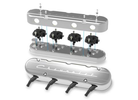 - Coil cover features vintage valve cover styling with a prominent GM Licensed “Chevrolet” script logo and cast-in wiring provisions